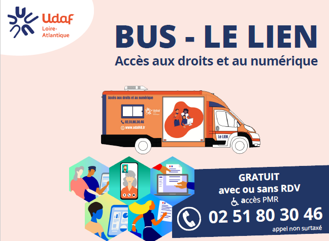 L’UDAF Loire-Atlantique met à disposition un bus accessible PMR avec à son bord, un conseiller numérique et un chargé d’information qui vont à votre rencontre afin de vous apporter une aide dans toute démarche d’accès aux droits et vous proposer un accompagnement à l’usage du numérique.